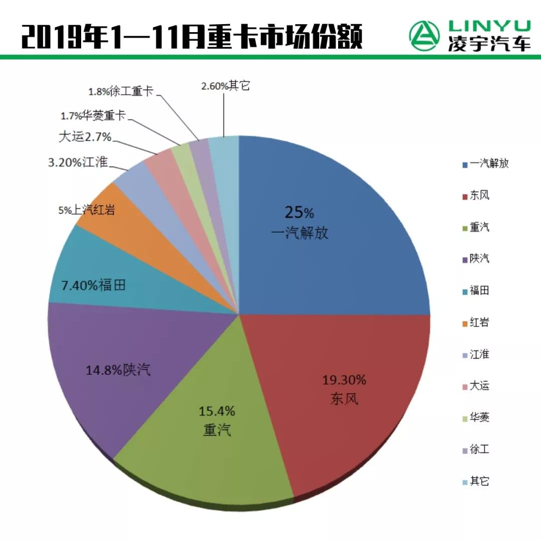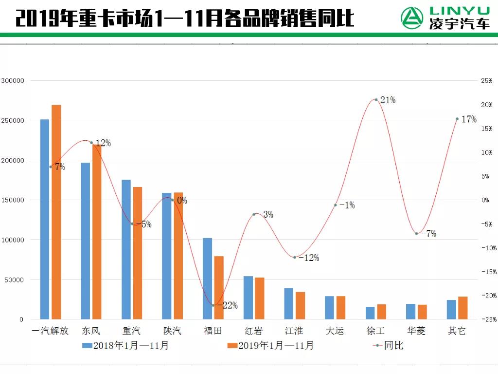 從數據可以看出,一汽解放11月份銷售重卡1.75萬輛,今年1-11月,解放重卡累計銷售26.91萬輛,同比增長7%,市場份額為25%,毋庸置疑,繼續(xù)穩(wěn)坐行業(yè)累計銷量寶座。