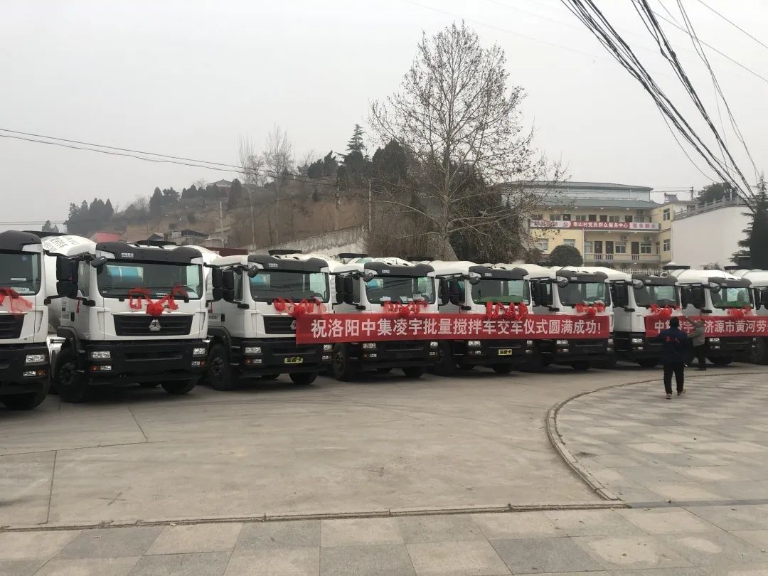 1月24日,中集凌宇為濟(jì)源老客戶舉辦的交車儀式上,13臺(tái)披紅戴花的凌宇攪拌車整體排列,蔚為壯觀。
