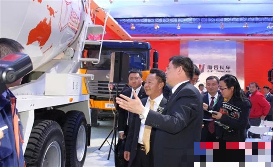 此次參展的混凝土攪拌車上裝是中集凌宇的暢銷產(chǎn)品,美觀大方的罐體結(jié)合聯(lián)合卡車高端底盤(pán),成為展廳一大亮點(diǎn)。上圖為中集集團(tuán)總裁麥伯良饒有興致參觀這臺(tái)攪拌車,中集凌宇副總經(jīng)理胡柏林向麥總介紹凌宇上裝。
