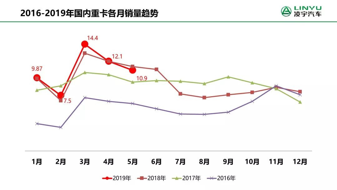 5月重卡以銷售10.9萬輛結(jié)束,環(huán)比下降8%,同比下降4%。重卡市場2019年1-5月的月均銷量為11.06萬輛,比上年同期的11.2萬輛下滑1%。從累計(jì)銷量來看,重卡行業(yè)1-5月共計(jì)銷售55.34萬輛,比上年同期的56萬輛下滑1%。
