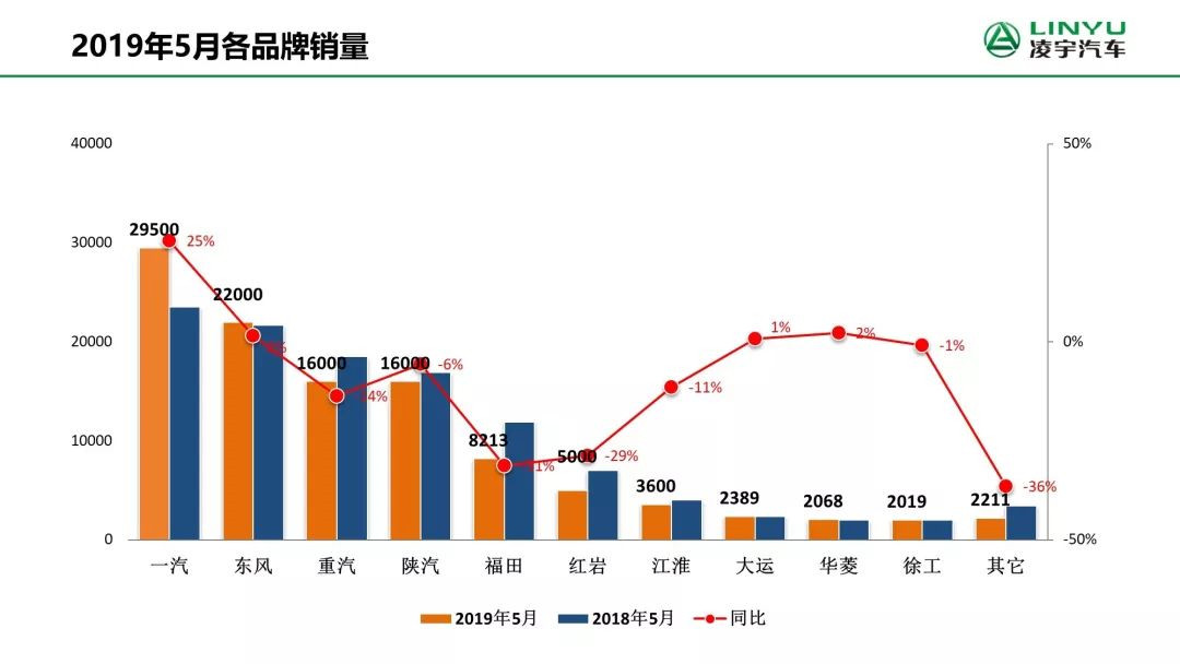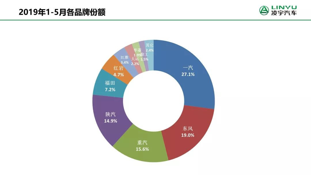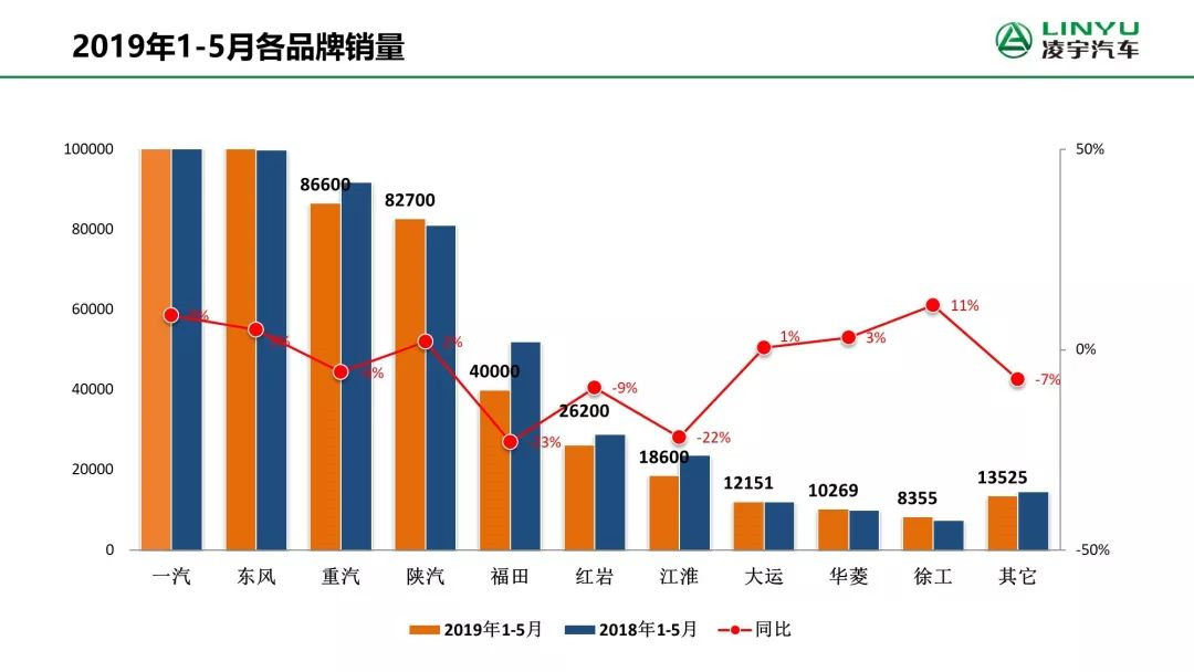 東風(fēng)進(jìn)步穩(wěn)固了亞軍的行業(yè)地位。5月份,東風(fēng)重卡銷售2.2萬輛,同比增長2%;今年1-5月,東風(fēng)重卡累計(jì)銷售10.49萬輛,同比增長5%,市場占有率提高到19%,穩(wěn)居行業(yè)二。