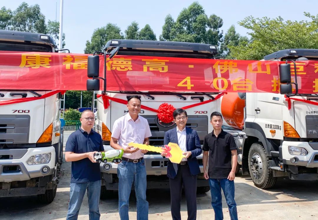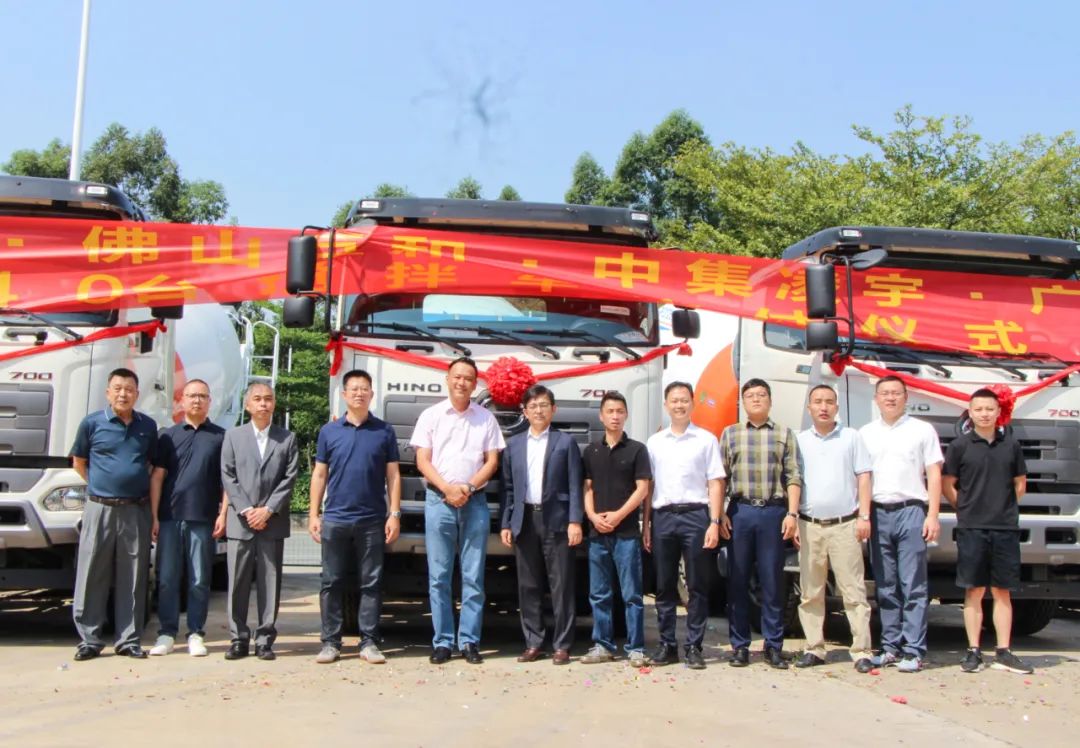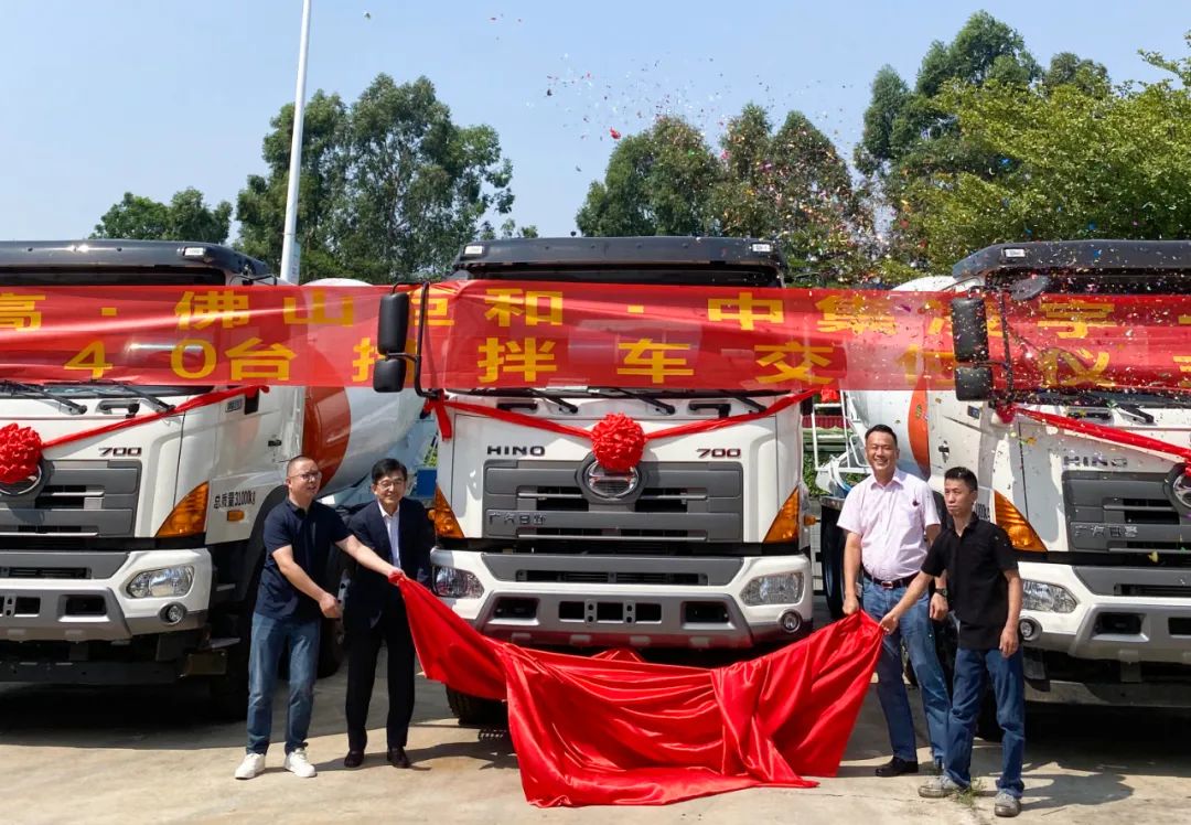 9月24日,廣東佛山,中集凌宇&廣汽日野&康福德高&佛山巨和舉行了一場別具一格的交車儀式。活動現(xiàn)場,40臺嶄新的廣汽日野攪拌車披紅戴花,整齊排列,氣勢如虹。四方代表共切燒豬喜氣洋洋,以此象征財運滾滾來。
