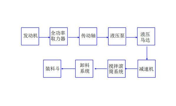 2、液壓傳動(dòng)系統(tǒng):將經(jīng)取力器取出的發(fā)動(dòng)機(jī)動(dòng)力,轉(zhuǎn)化為液壓能(排量和壓力),再經(jīng)馬達(dá)輸出為機(jī)械能(轉(zhuǎn)速和扭矩),為攪拌筒轉(zhuǎn)動(dòng)提供動(dòng)力。