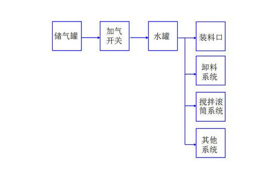 通過制動(dòng)系統(tǒng)的儲(chǔ)氣筒給水罐加壓,水流經(jīng)過加壓清洗攪拌罐系統(tǒng),裝料口,卸料系統(tǒng)等。
