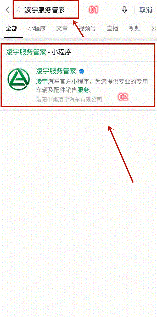 1.微信消息界面下拉,搜索『凌宇服務(wù)管家』,點(diǎn)擊進(jìn)入;